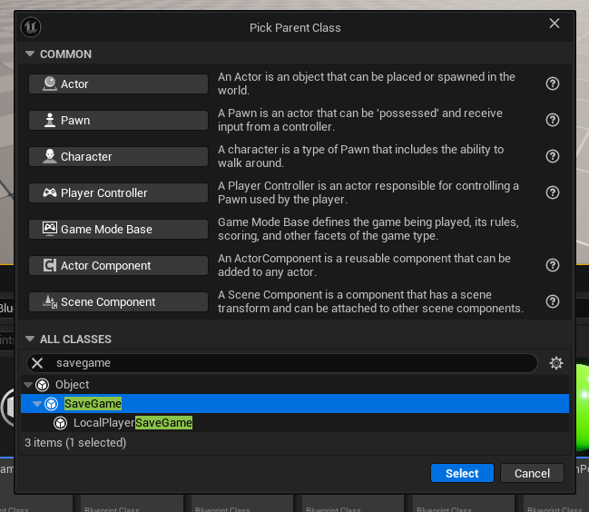 Blueprint 폴더에서 SaveGame 클래스 블루프린트 생성