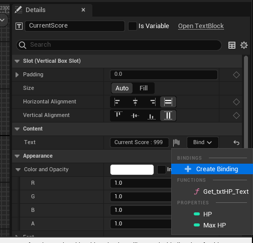 다시 WBP_UIScreen으로 돌아와서 CurrentScore 선택 후 Create Binding
