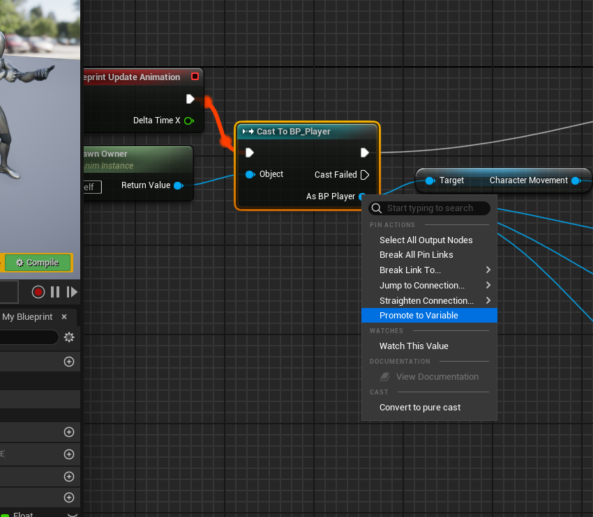 BP_Player를 뒤에서도 쓸 예정이므로 Promote to Variable 한다.