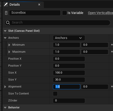 ScoreBox는 Anchors를 우측 상단으로, 포지션과 Alignment를 설정한다.