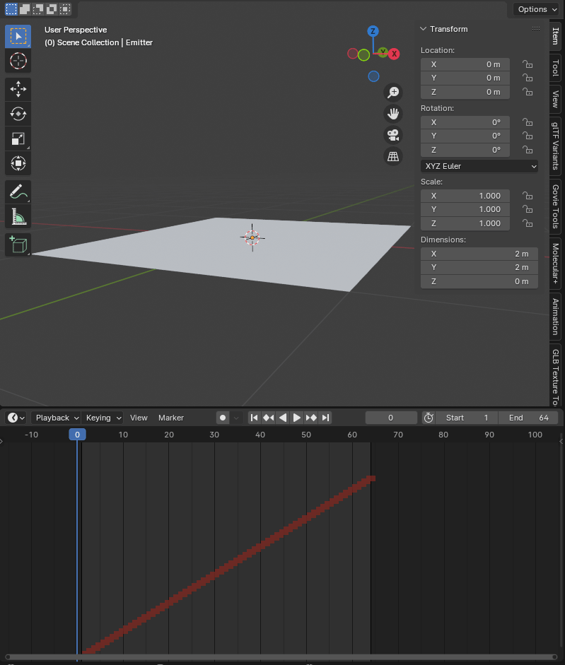 - 파티클 시스템을 적용할 오브젝트를 하나 생성한다. (예시로 Plane을 하나 생성하여 이름은 “Emitter”로 바꾸었다. 구분하기 쉽게 Collection 바깥에 위치시켰다.)