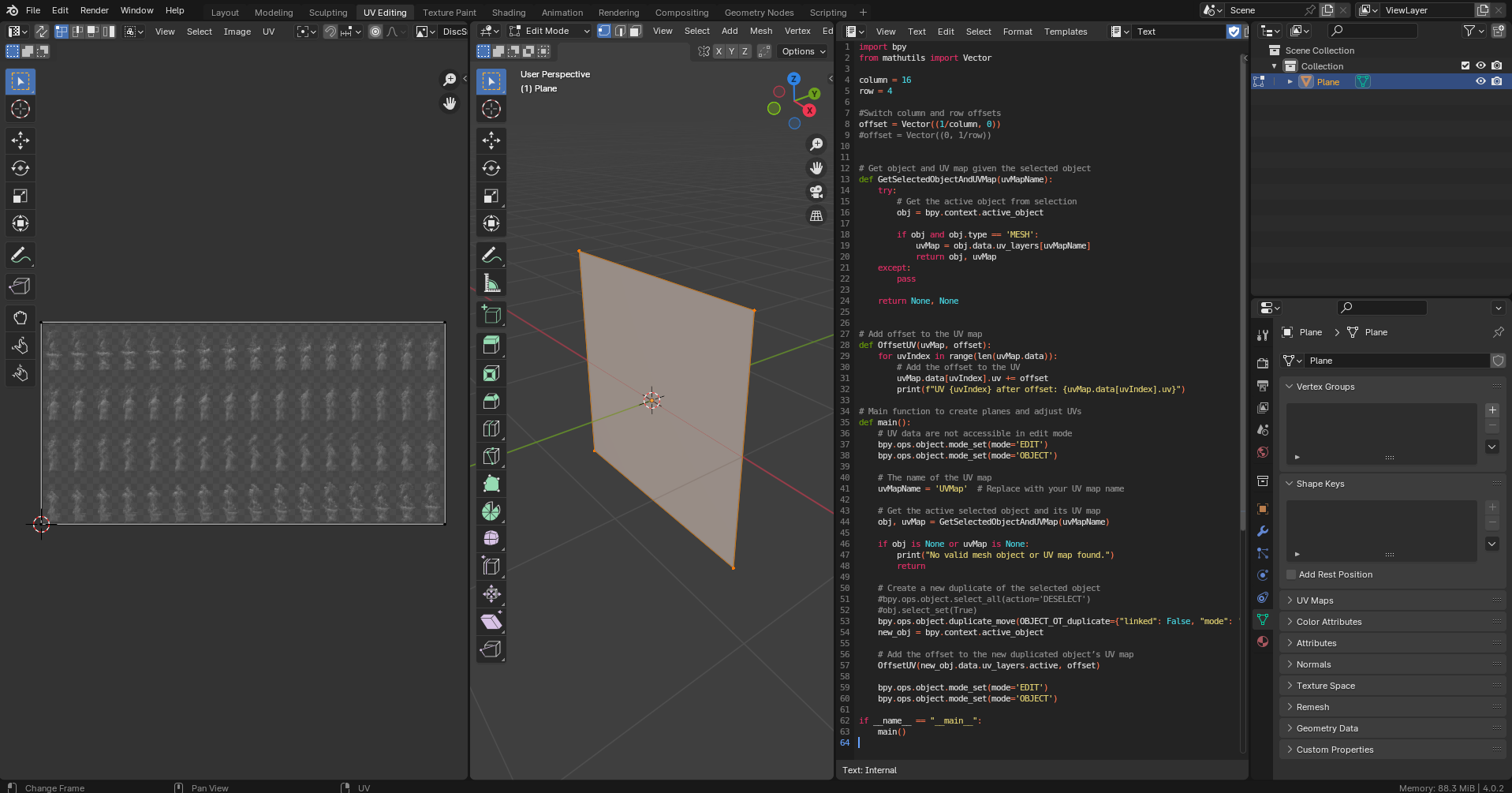 - UV Editing 모드에서 Text Editor 창을 열어서 스크립트를 넣는다. 이 때, Plane의 UV는 텍스쳐 전체를 덮고 있어야 한다. 가끔 UV unwrap을 하면 텍스쳐의 일부만 덮는 경우가 있는데, 이 경우에는 Unwrap 후 [Correct Aspect]를 체크 해제하면 된다.