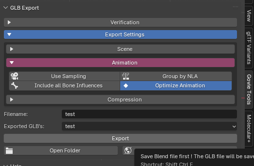 이제 export를 위해서 Govie Tools 설정을 바꾼다. [Export Settings] - [Animation]에서 [Group by NLA]로 설정되어 있는 부분을 [Optimize Animation]으로 바꾼 후 추출할 파일 이름을 설정한 후 [Export] 버튼을 눌러서 Export 한다.