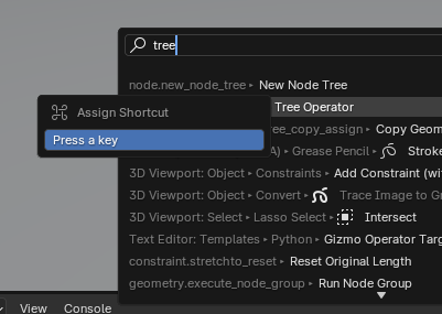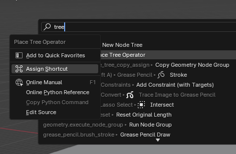 해당 기능을 단축키로 실행되게 만들기 위해서 [Edit] - [Menu Search…]에서 “Place Tree Operator”를 찾고 마우스 우클릭하여 [Assign Shortcut]을 선택한다.