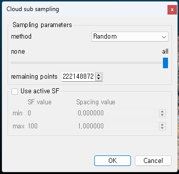 - Random : 전체 포인트 수 중에서 사용할 포인트 수를 직접 지정하여 줄일 수 있다. 현재 2억이 넘는 포인트를 2천만 정도로 줄일 수 있다는 뜻. 랜덤으로 줄어들기 때문에 전체적인 형상은 유지한다.