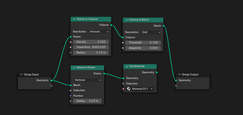 Geometry Node를 활용해서 볼 수 있다. 아래 [Mesh to Points] - [Set Material]은 색상을 보는 용도, 위에 [Points to Volume] - [Volume to Mesh]는 메쉬화 하는 노드이다.
