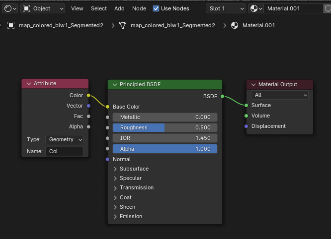- 메테리얼을 하나 생성해서 [Attribute] 노드를 추가하고 컬러를 연결한다.