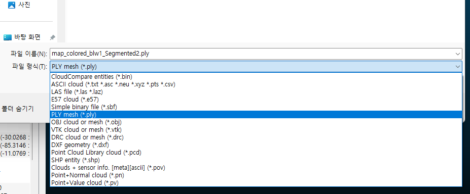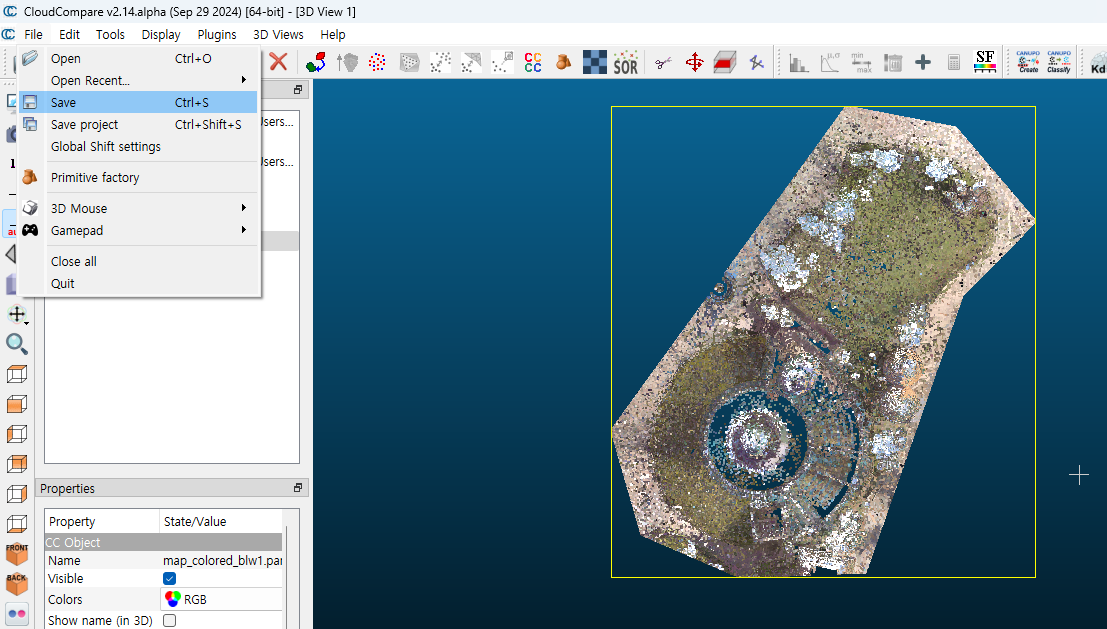 - ply 파일로 export 할 포인트 클라우드 데이터만 viewport에 띄워놓은 후 [File] - [Save]에서 ply 포맷으로 저장하면 된다.