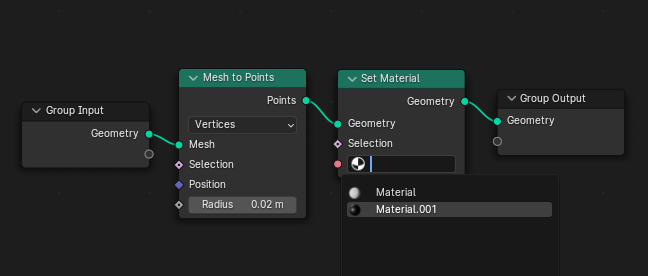 - [Mesh to Points]와 [Set Material] 노드를 생성하여 연결한다.