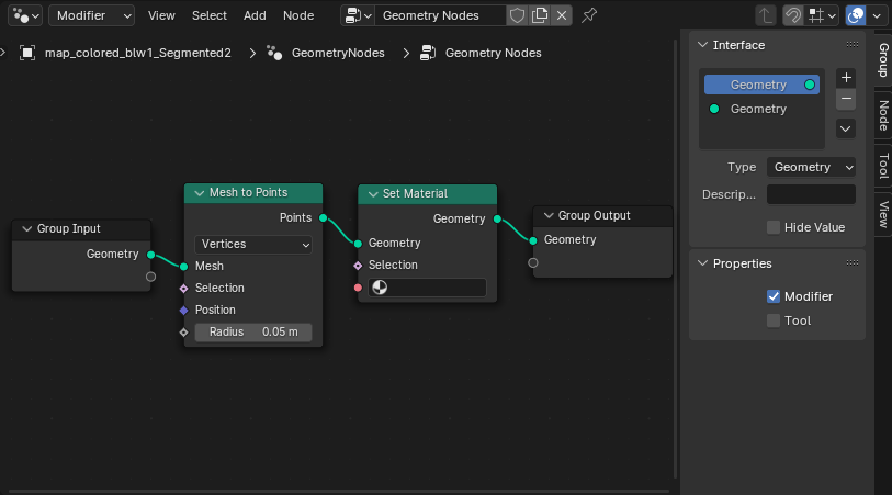 *Geometry Node 원형 크기를 늘려서 더 선명하게 보는 방법이 있다. 0.02m → 0.05m로 확대