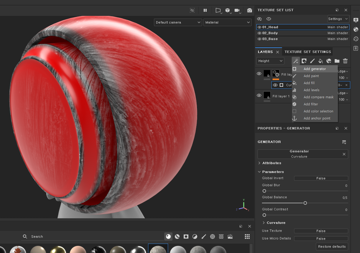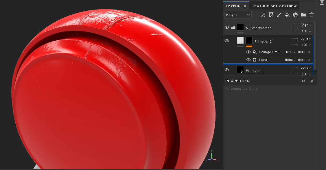 - [TEXTURE SET LIST] 밑에 [LAYERS] 에서 레이어 추가/제거 가능, 레이어 별로 특성 조절 가능