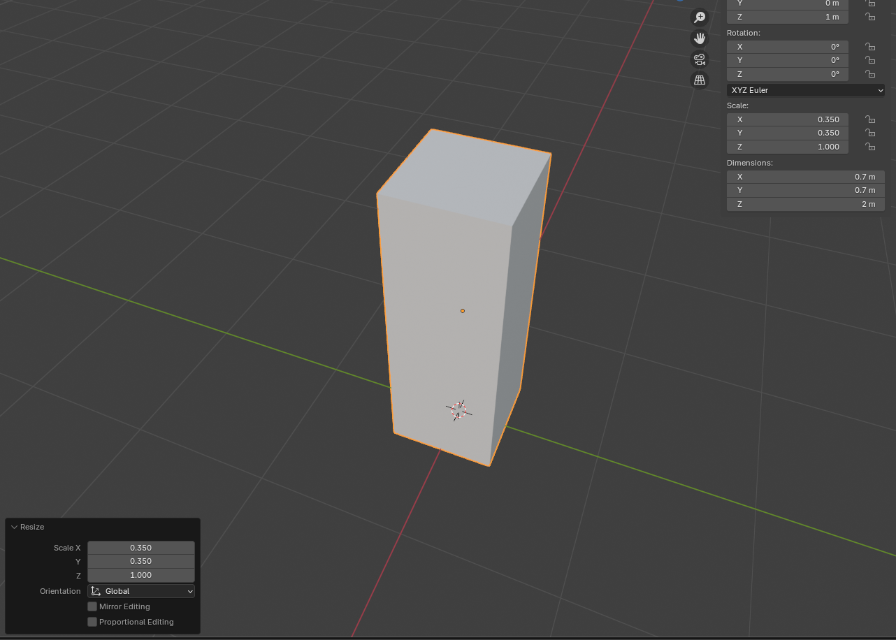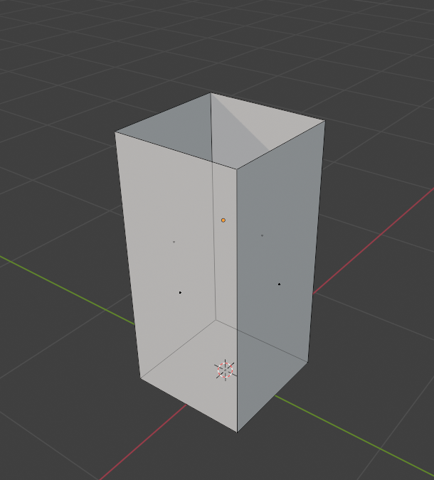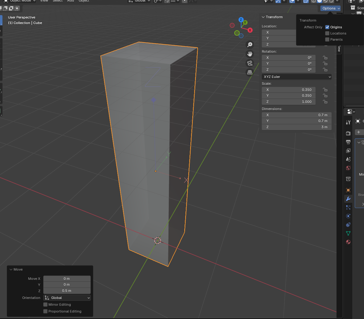 큐브 만들어서 원점에 맞춘 후 X, Y 스케일 줄여서 아래와 같이 만든다.