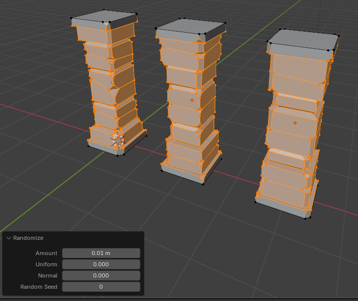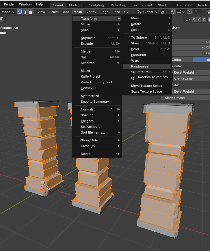 *참고로, 상단 탭 중에서 [Mesh] - [Transform] - [Randomize] 메뉴를 찾을 수 있는데 이를 이용하면 일부러 메쉬를 약간 뒤틀리게 해서 랜덤성 있게 낡게 만들 수 있다.