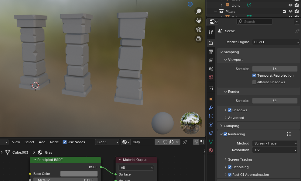 메테리얼을 설정한 후 [Render] 모드에서 [Raytracing]을 체크했다. [Raytraing]이 없으면 [Ambient Occlusion]과 [Screen Space Reflection]을 체크한다.