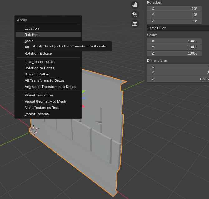 오브젝트를 Mirror 하기 위해서 [Ctrl + A]를 눌러 Rotation을 Apply 한다.