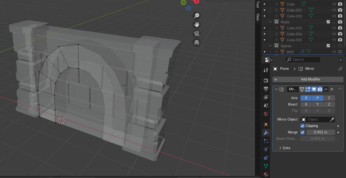 Plane의 윗 엣지를 잡고 [E]로 늘려가면서 문 모양을 만든다. [Mirror] Modifier의 [Clipping]을 켜서 잘 합치면 좋다.