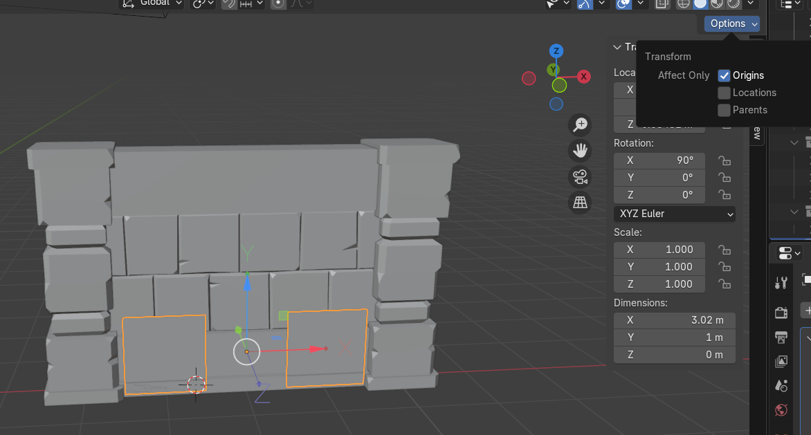 Object Mode에서 X축이 90도 설정되어 있던 것을 [Ctrl + A] - [Apply Rotation]을 통해서 어플라이 한 후 Origin을 Y축 영점으로 옮겨서 Mirror의 X, Y를 둘 다 켜면 문 반대편에도 잘 생성된 것을 볼 수 있다.