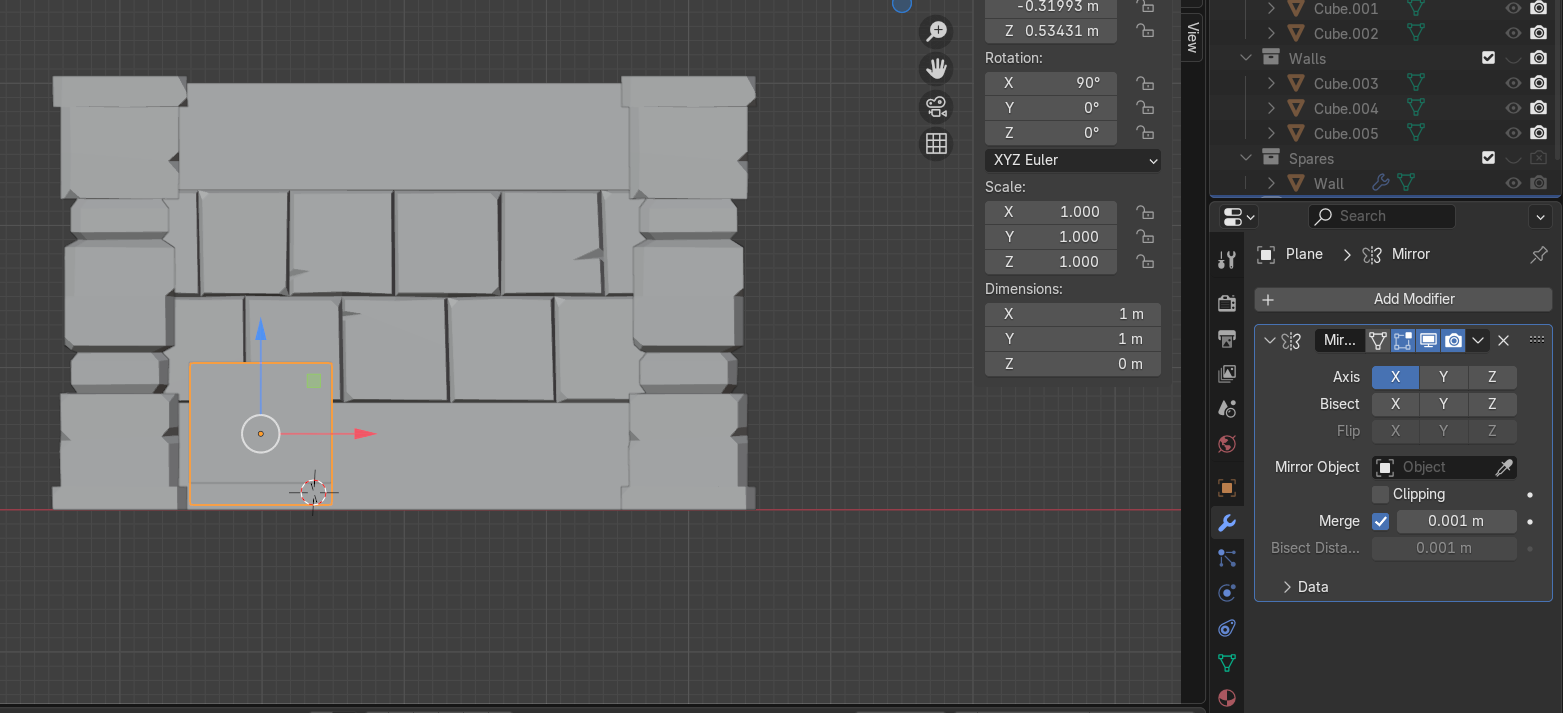 1m 크기의 Plane을 하나 만들어서 X축으로 90도 회전시켰고, [Mirror] Modifier를 추가했다.