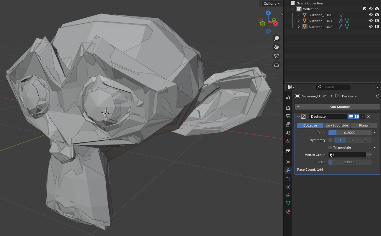 Suzanne_LOD2은 Decimate Ratio 0.2 적용
