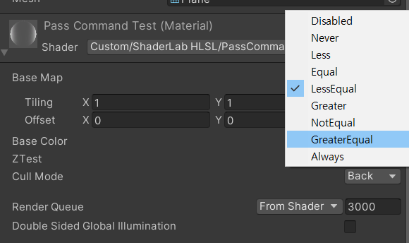 ZTest [_ZTest] // Disabled, Never, Less, Equal, LessEqual, Greater, NotEqual, GreaterEqual, Always