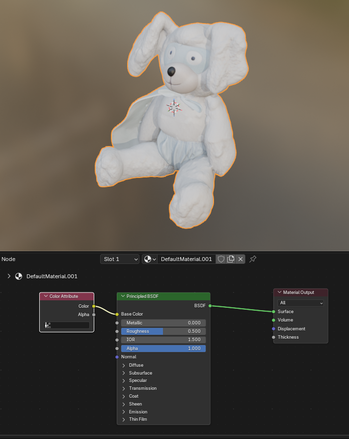 메테리얼은 Color Attribute 노드를 통해 Vertex Color를 가져오는 것으로 확인된다.