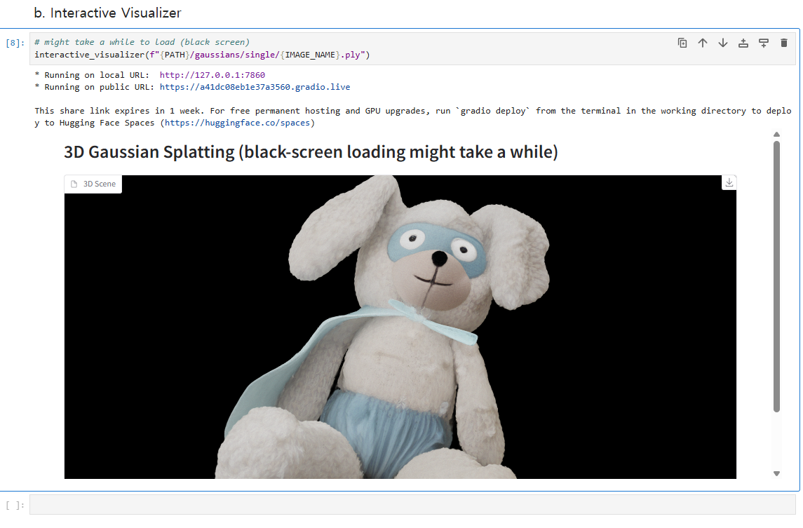 demo.py를 실행하면 index=14에 의해서 “shutterstock_stylish_kidsroom_1640806567” 폴드의 14번째 이미지인 토끼 인형의 ply 파일이 output으로 나오게 된다.