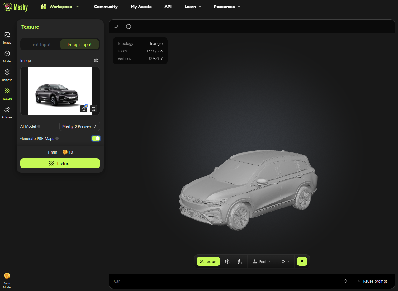 - Sparc3D 텍스쳐링 기능이 그동안 없었어서 텍스쳐링은 Meshy.AI에서 AI Texturing으로 처리하는 플로우였는데, Hitem3D Official Product 페이지에서는 현재 옵션으로 지원하는 것으로 나온다.