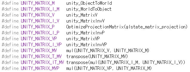 프로젝트에서 [Packages] - [Universal RP] - [ShaderLibrary] - [Input.hlsl] 파일을 열면 URP가 제공하는 공간 변환용 행렬 변수들을 볼 수 있다. I(Inv)는 역행렬을 의미한다.