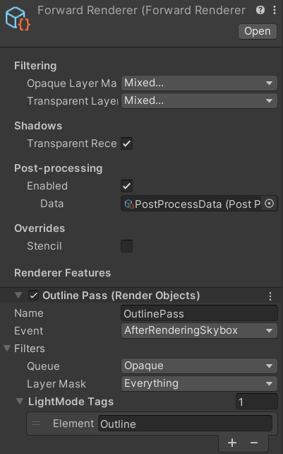 프로젝트의 렌더러 피쳐에서 [LightMode Tags] 항목에 Element 0으로 "Outline"이 추가되어 있는 것을 볼 수 있다.