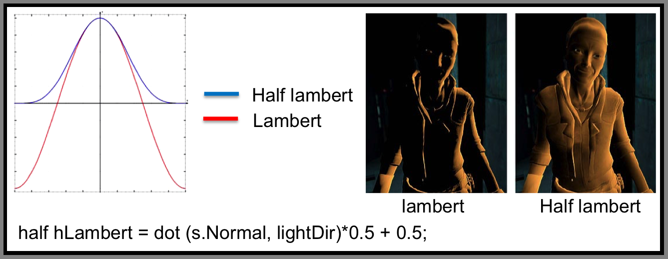 밸브 게임사에서 만들었던 BRDF이다. 그냥 램버트가 특정 경계에서 극단적으로 어두워지는 느낌이라면 하프 램버트는 부드럽게 라이팅 된다.