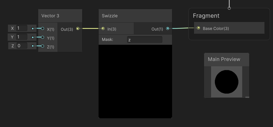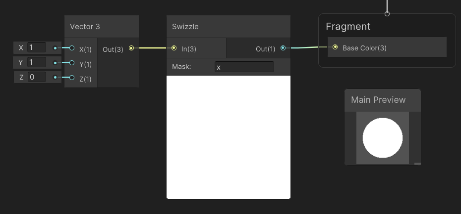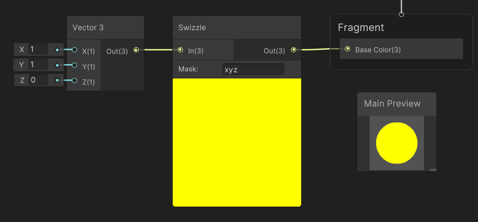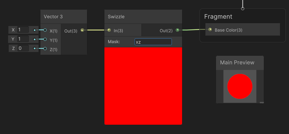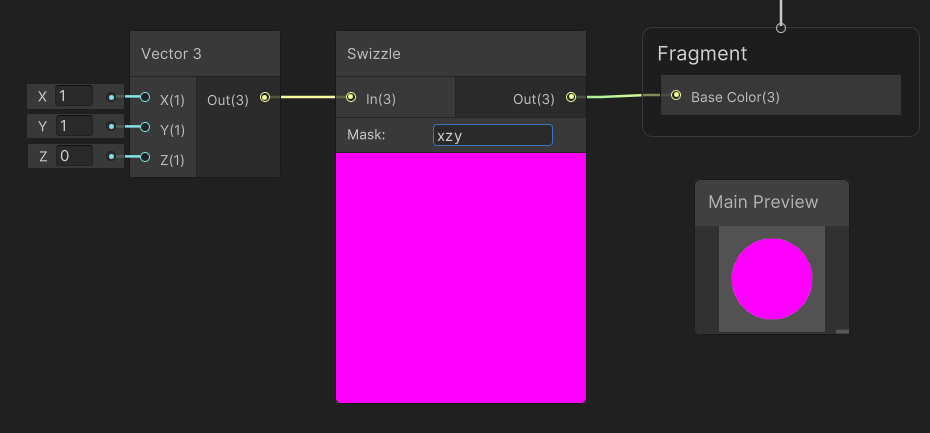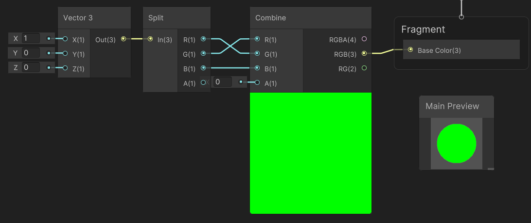 위의 셰이더 그래프를 보면 [Vector 3]에서 출발한 값이 [Split]을 통해 나뉘어졌고, 다시 [Combine] 노드를 지나면서 합쳐진 것을 볼 수 있다. [Split]과 [Combine] 사이 노드를 이어줄 때, R에 있던 1 값을 G로 보내면서 한 번 꼬아진 것을 볼 수 있다. 결과적으로 색은 (0, 1, 0)인 초록색이 나오게 되고 이것을 [Swizzle]이라고 부른다.