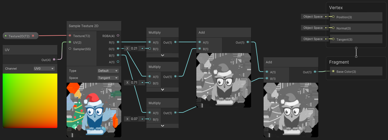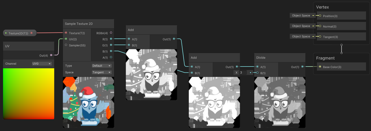 R 채널, G 채널, B 채널이 각각 흑백이기 때문에 [Add] 노드로 더해도 흑백이 유지된다. 하지만 밝기는 점점 밝아지는 것을 볼 수 있다. 이후 [Divide] 노드로 3을 나눈 것을 볼 수 있다.
