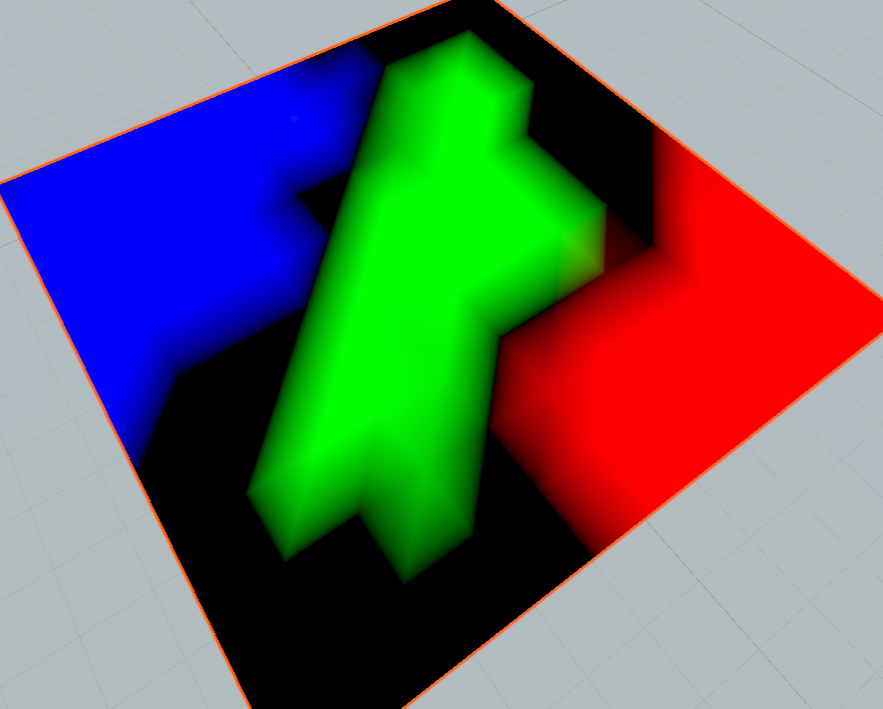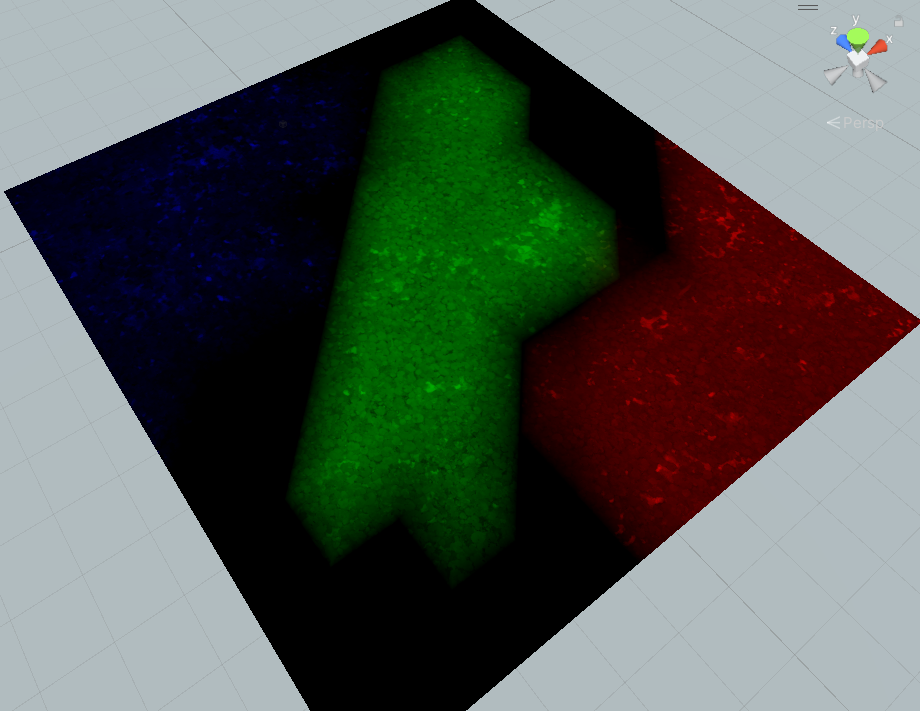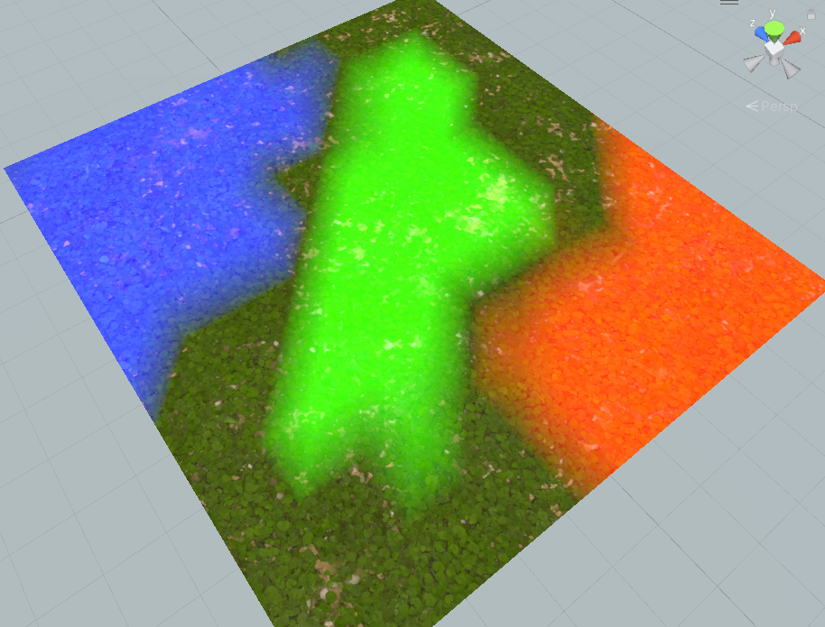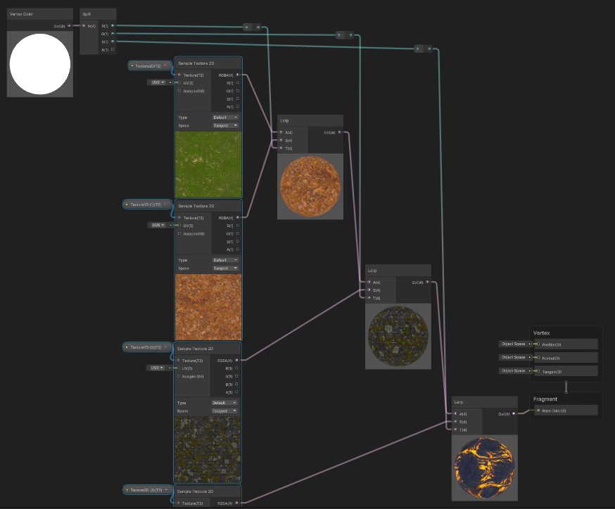 예제 4개의 텍스쳐를 쭉 입력하고 각각을 [Lerp] 노드를 이용해 [Vertex Color]의 R, G, B 채널의 값으로 조절해주면, 검은색 Plane이라고 했을 때, 바탕은 첫번째 텍스쳐가 되고, Vertex Color 빨간색을 칠한 곳은 두번째 텍스쳐가 되고, 초록색을 칠한 곳은 세번째 텍스쳐가 되고, 파란색을 칠한 곳은 네번째 텍스쳐가 된다. 실시간으로 버텍스 컬러를 다르게 칠하는 것만으로 텍스쳐의 블렌딩이 바뀌게 된다.