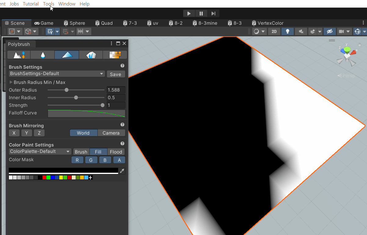 Package Manager에서 Poly Brush를 다운 받고 Poly Bursh Window로 기본 Plane에 Vertex 색을 칠할 수 있다.