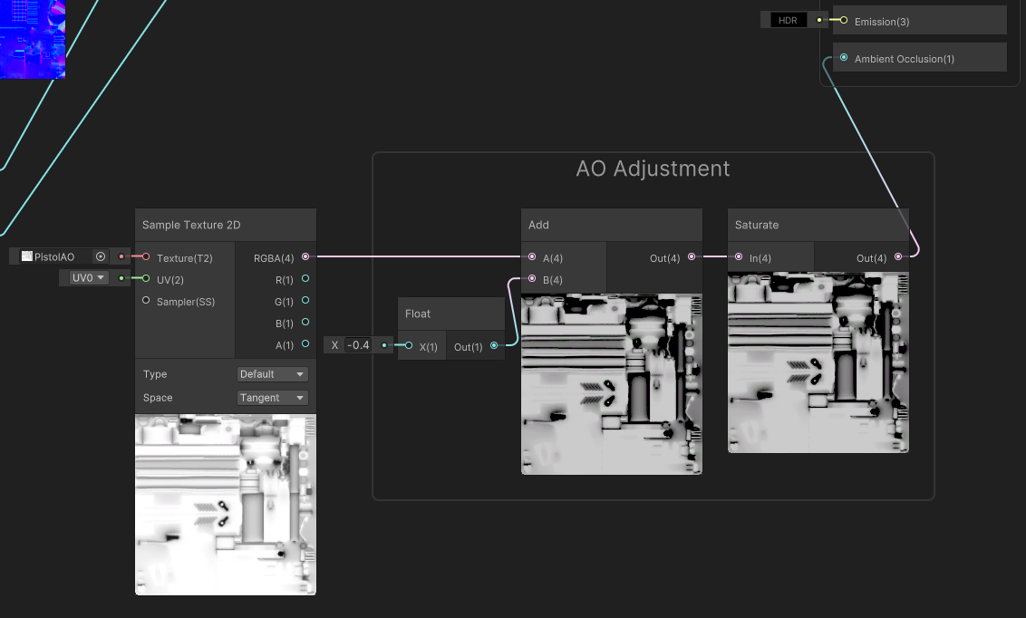 AO 텍스쳐는 [Ambient Occlusion] 부분에 바로 연결할 수 있는데, [Add], [Saturate] 노드와 연결하여 그 정도를 조절할 수 있다. 마이너스 값을 더하면 더 어두워지고 [Saturate] 노드를 이용하여 0 이하의 값을 0으로 만들어준다.