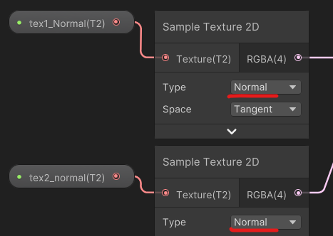 *여기서 , Normal Map에 쓰이는 [Sample Texture 2D] 노드에 [Type]을 [Normal]로 설정해야하는 것도 중요하다.