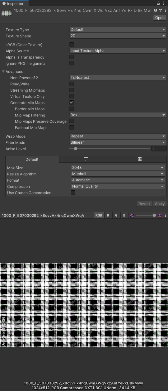 [Texture Type] - [Normal map] 으로 설정하고, [Create from Grayscale] 체크, 이후 [Bumpness]와 [Filtering]을 조절한다.