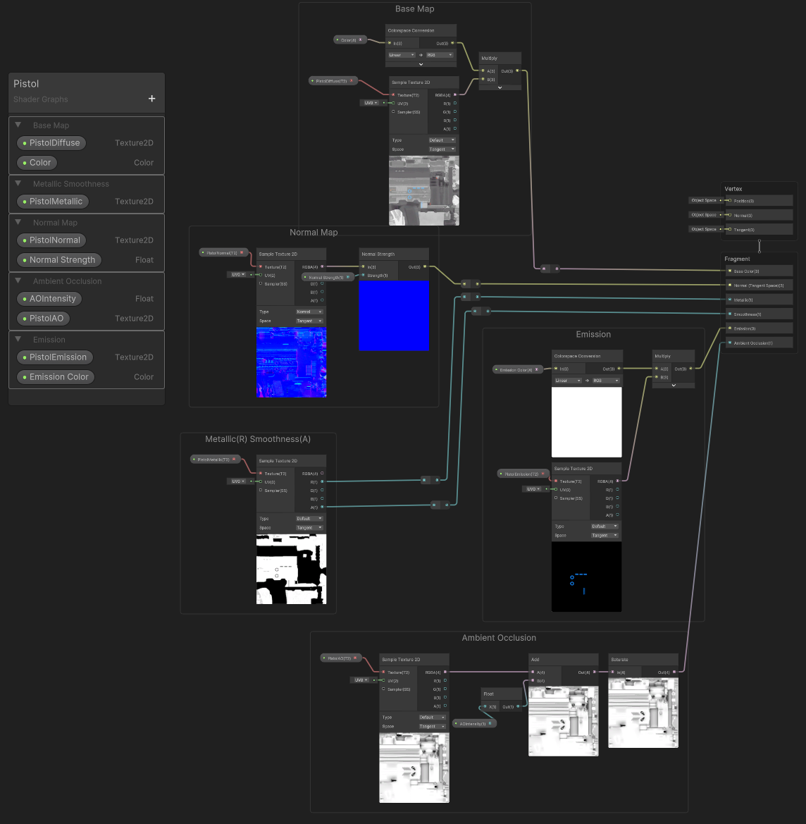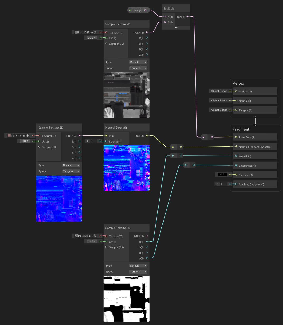 이후 Diffuse(Albedo)는 컬러 값과 곱하여 Base Color에 연결하고 Metallic은 R값은 Metallic에, A알파값은 Smoothness에 들어있으므로 맞는 곳에 연결한다. (*만약 Smoothness 텍스쳐가 따로 있다면 데이터로 쓰이는 텍스쳐이기 때문에 [sRGB] 체크를 해제해서 써야한다.)