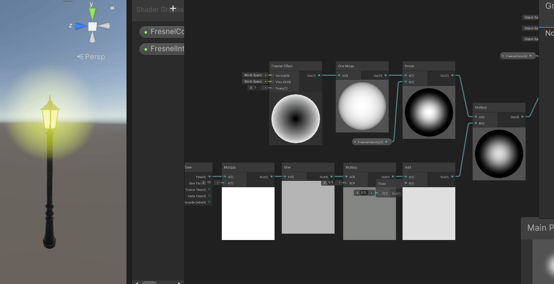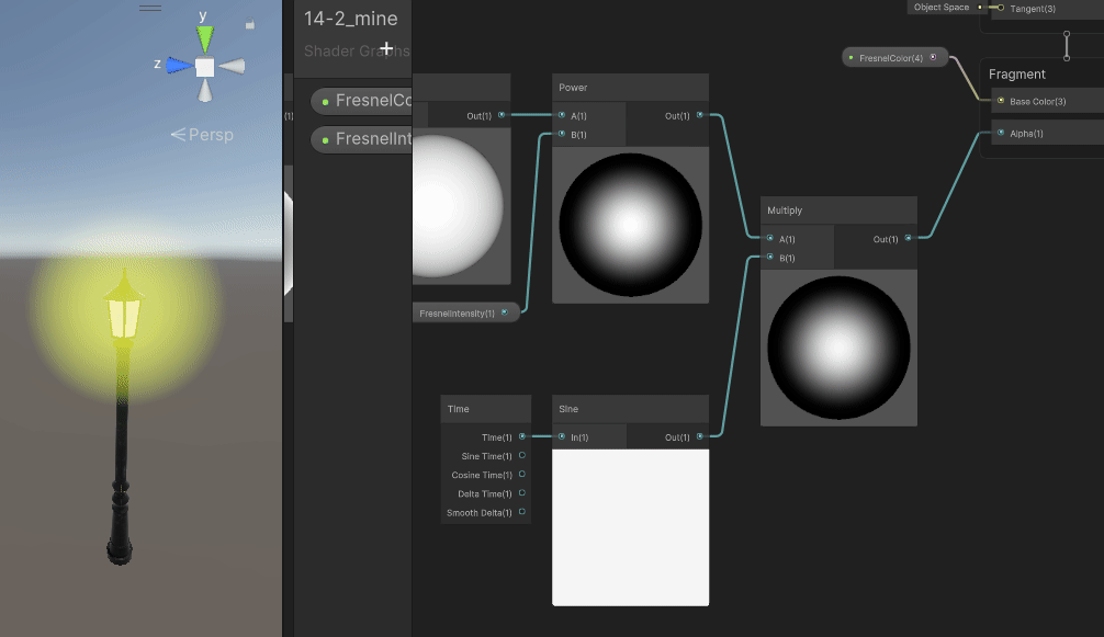***여기서 [Time] 노드에서 Sine Time을 사용하지 않고 그냥 Time에 [Sine] 노드를 연결한 이유는 Sine Time을 사용하면 깜빡이는 속도를 조절할 수 없기 때문이라고 한다. 따로 쓰는 게 응용하기 좋다고 한다. 이전에 비에 젖고 마르는 돌 셰이더를 만들었을 때 주기를 어떻게 하면 짧게 할 수 있을지 고민했었지만 Sine Time을 그냥 사용하고 넘어갔었다.