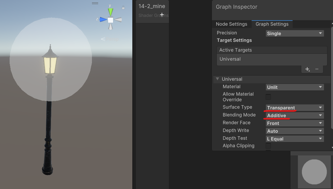조명 효과를 줄 것이기 때문에 [Surface Type] - [Transparent], [Blending Mode] - [Additive]를 적용시켜 준다.