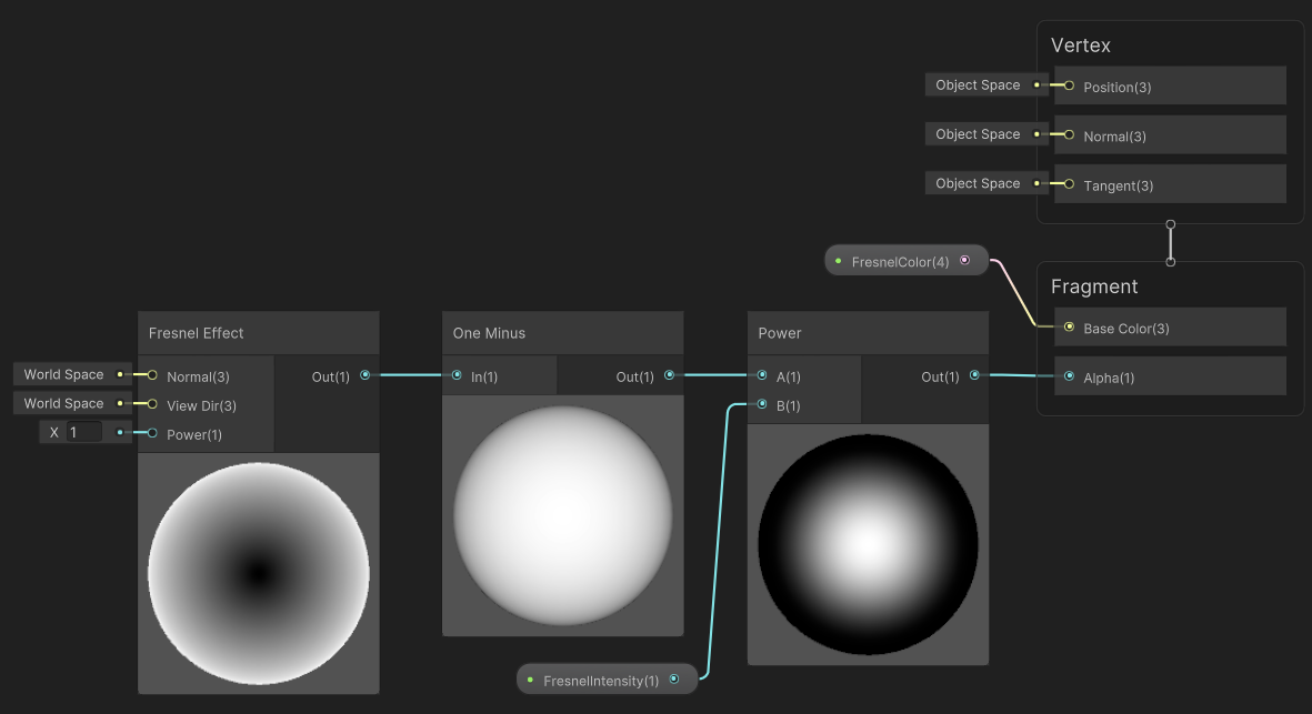 [Fresnel Effect] 노드 안에 [One Minus]가 들어 있는 것은 이전 글에서 직접 프레넬 효과 셰이더를 만들 때 봤었는데, 여기서 다시 [One Minus]를 연산하기 때문에 주변이 밝아지는 것이 아닌 가운데가 밝아지는 효과가 나온다. 색상과 두께를 조절할 수 있다.