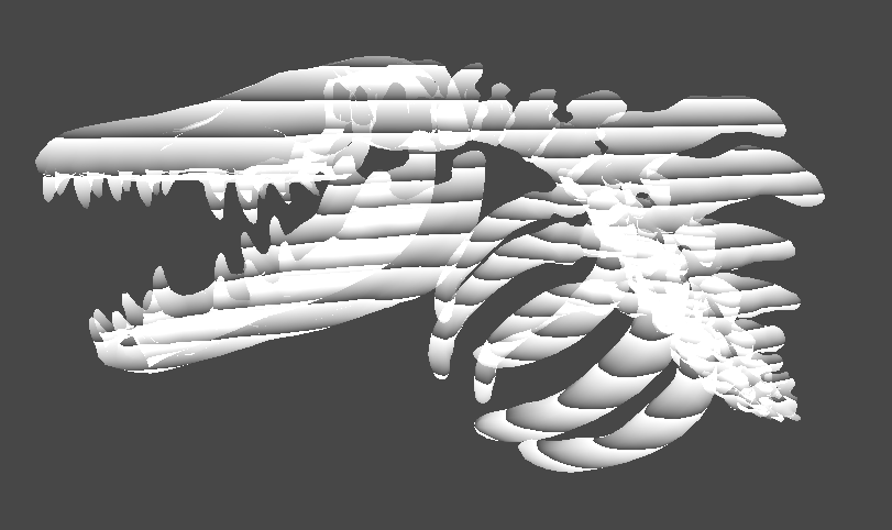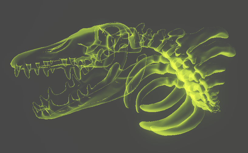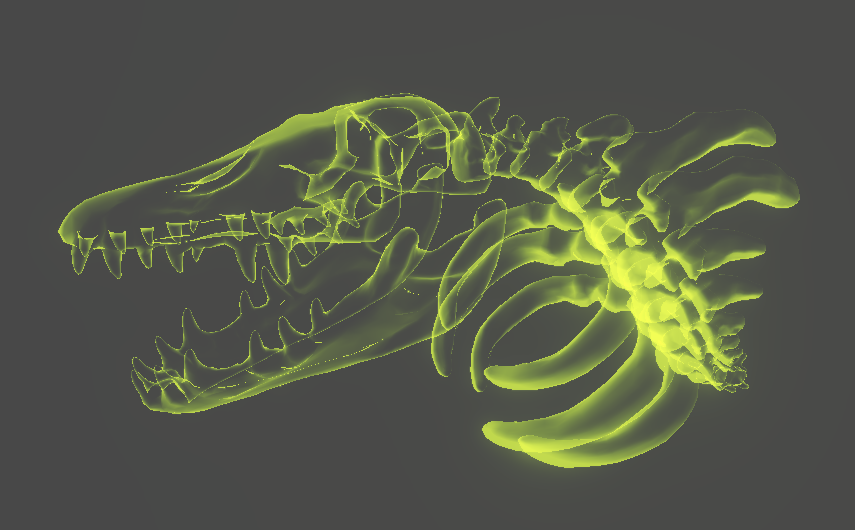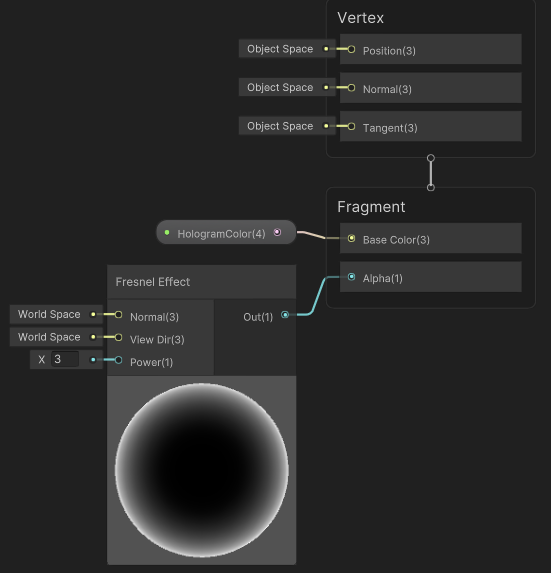 예제 공룡 뼈에 간단하게 홀로그램을 적용하기 위해 [Fresnel Effect] 노드를 연결해보면,