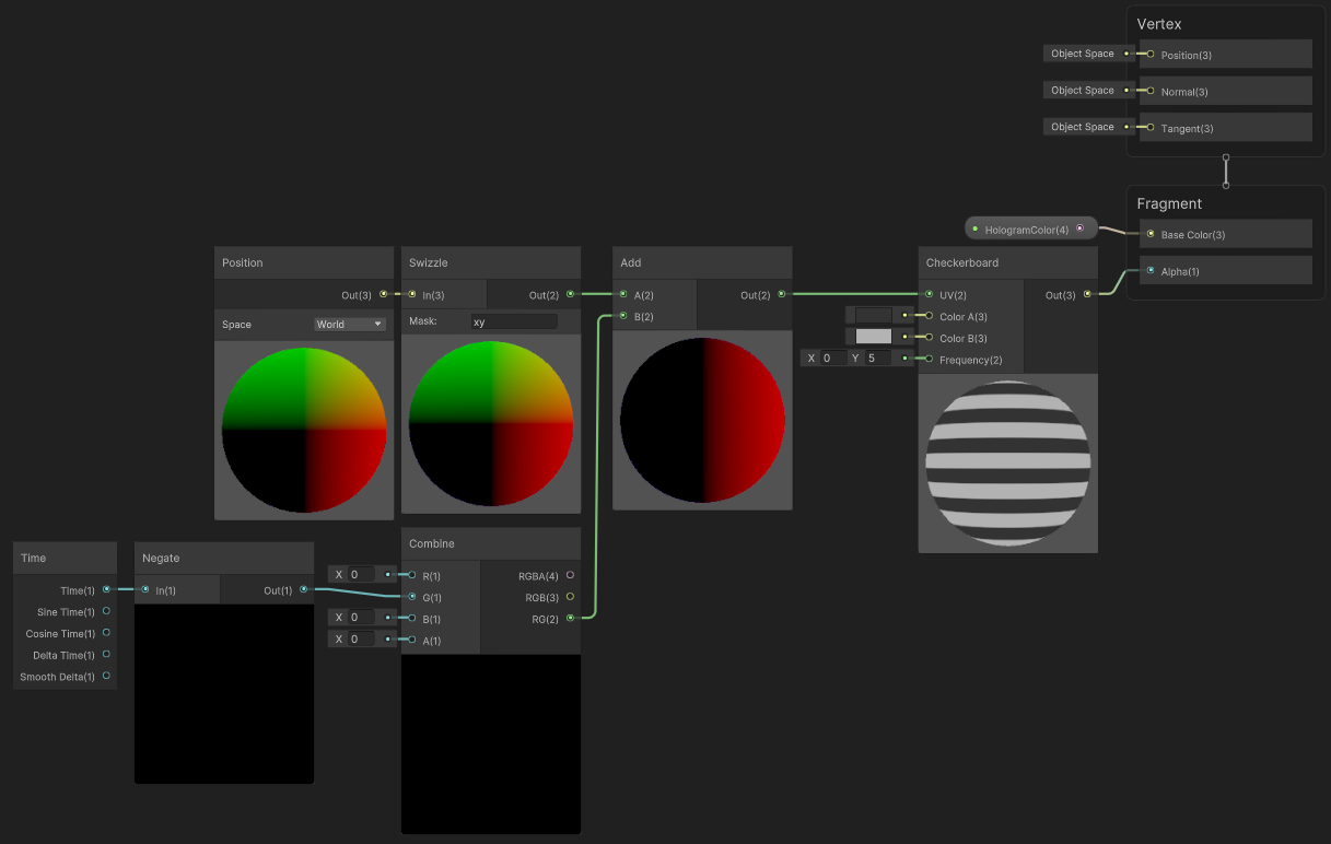 이제 줄무늬를 Y축 위쪽 방향으로 흘러가게 하기 위해서 [Time] 노드를 [Negate] 노드로 음수를 만든다. 이후 Y에 해당하는 [Combine]의 G에 연결하고 [Position] 노드로 만든 UV에 [Add]하면, Y축 음수 방향으로 시간에 따라 흐르게 된다.