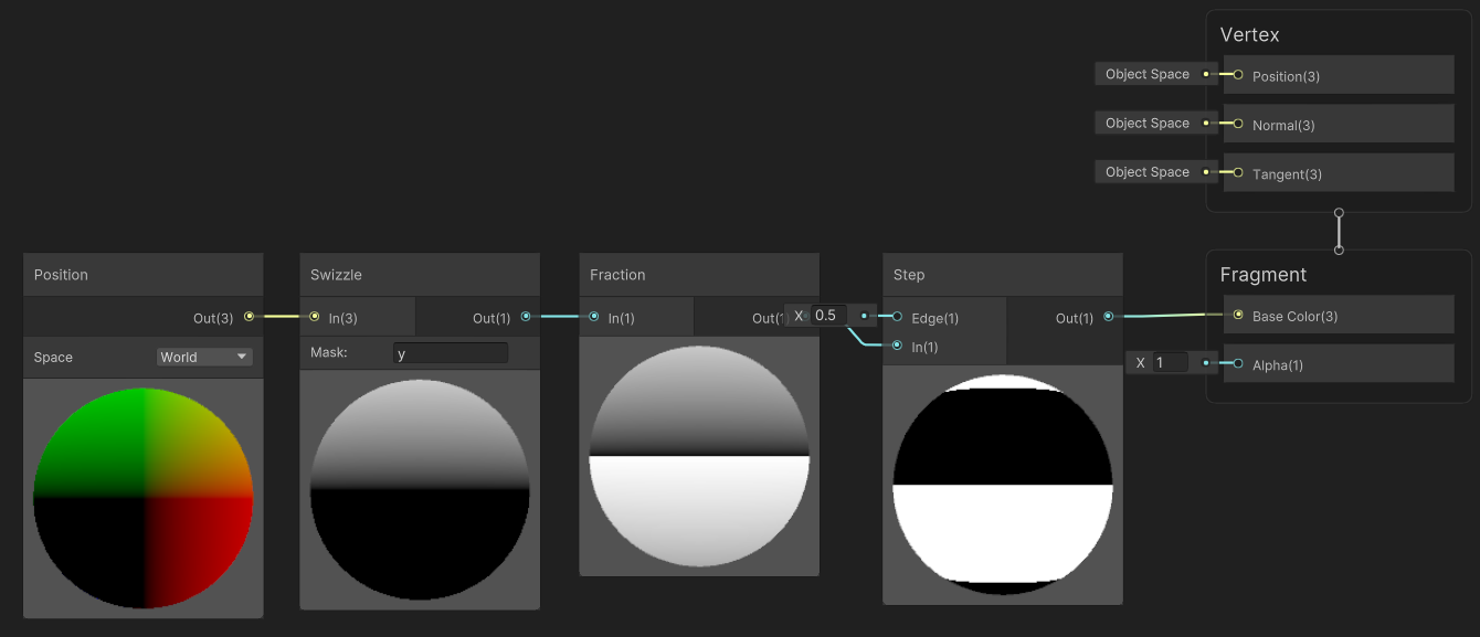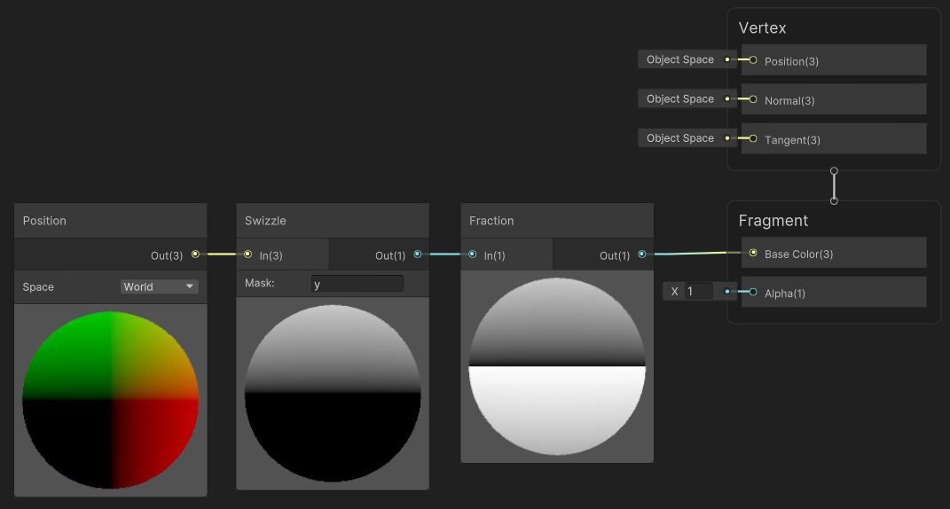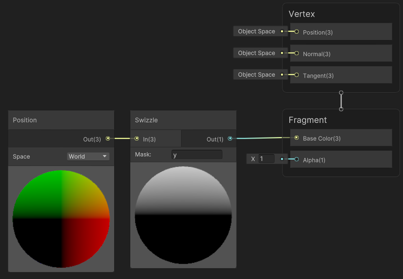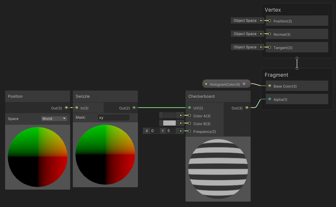 [Checkboard] 노드를 이용해 줄무늬를 만들고 UV를 [Position] 노드로 World Space로 만든다. 여기에 [Swizzle] 노드로 XY를 UV처럼 사용한다.