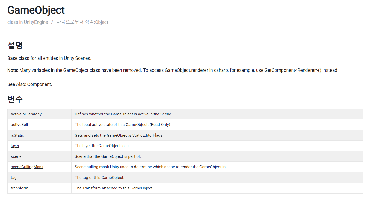 GameObject 클래스 : 유니티에서 사용되는 물체의 클래스 관리