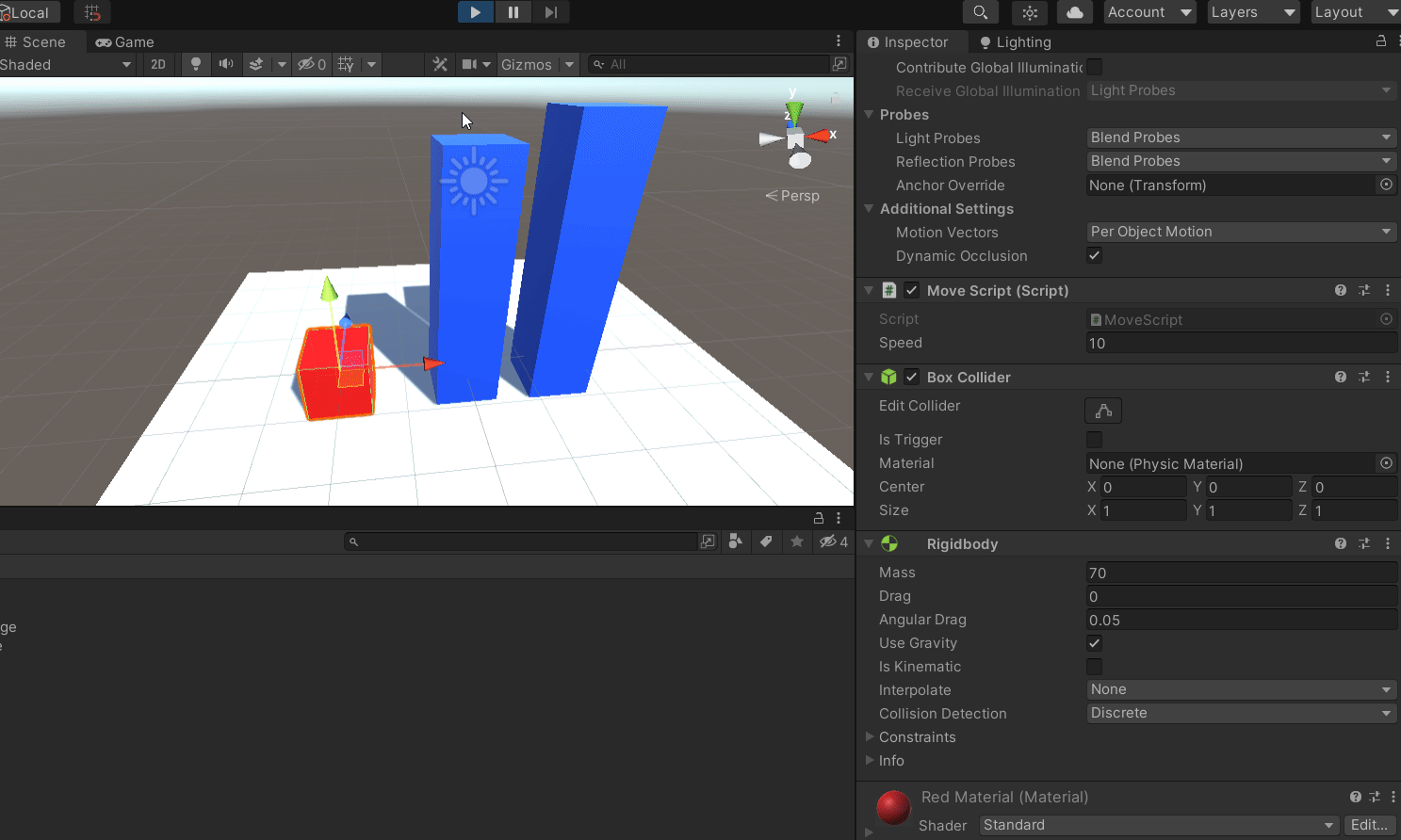 빨간색 플레이어 오브젝트가 부딪히면서 이동 방향이 바뀌어 바닥에 계속 충돌하는 오류가 생겼는데, 플레이어가 튕겨져나가게 하지 않기 위해서는 Is Kinematic을 활성화하면 된다.