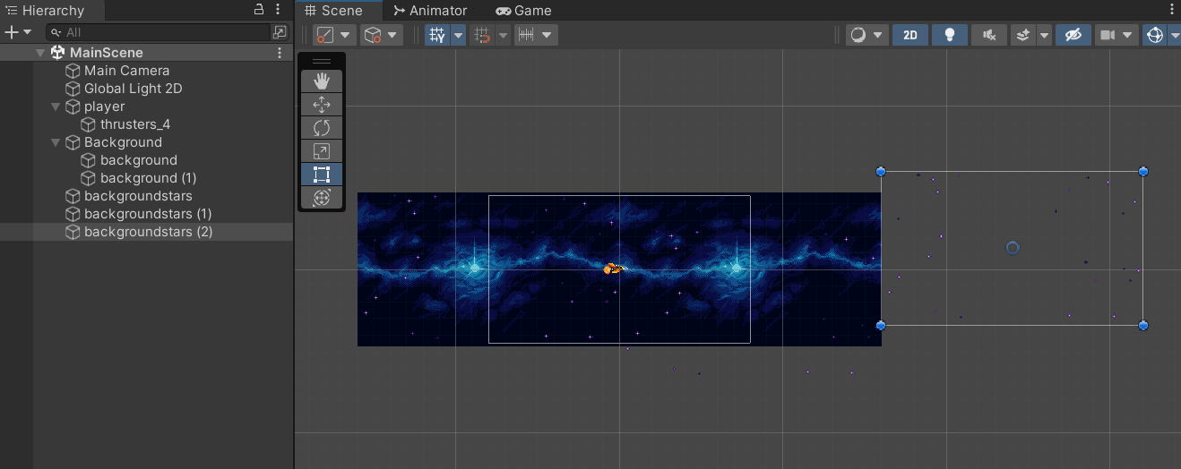 횡스크롤 게임이기 때문에 배경화면을 왼쪽으로 계속 움직여야 한다. 스크립트를 하나 만들어 조절한다. 왼쪽의 배경이 일정 값 이상 넘어가면 오른쪽으로 다시 옮겨서 무한 반복되게 만들어야 한다.