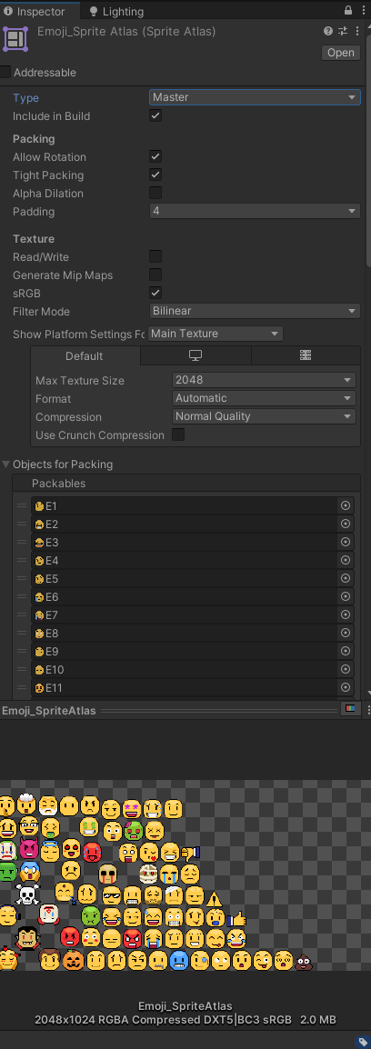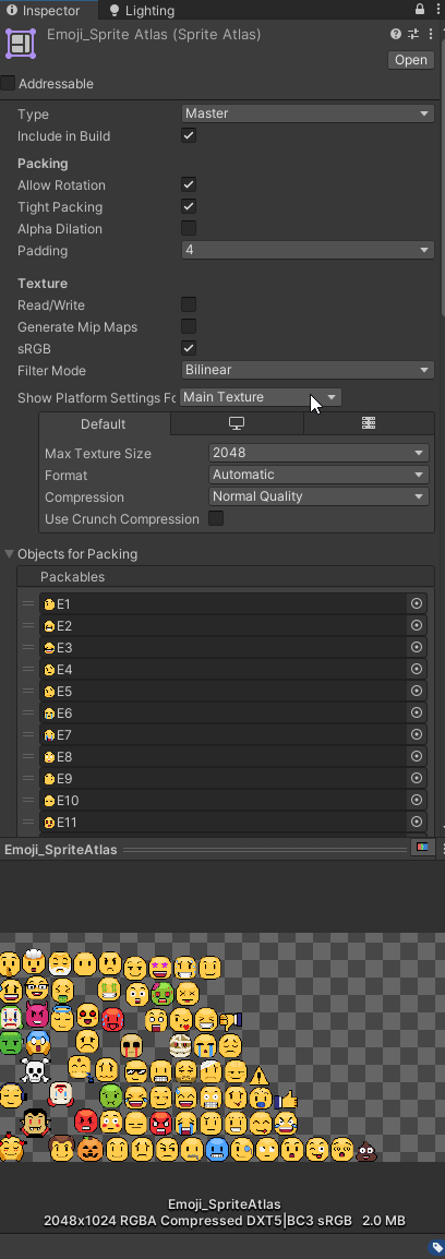 Max Texture Size를 조정하여 한 페이지에 얼마나 많은 스프라이트들이 들어갈지 정할 수 있다.