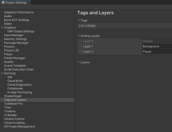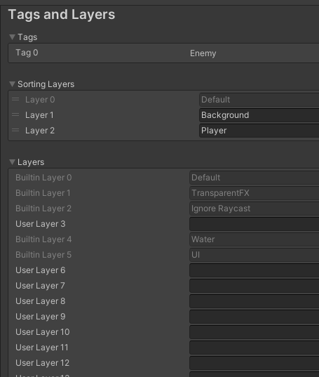 -Layer가 아래에 있을 수록 앞에서 보여지며, 같은 Layer라도 Order in Layer 값이 클 수록 앞에서 보여진다. - Physics Layer: 물리 연산할 때의 순서