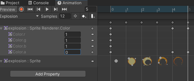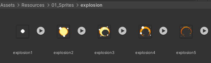 이전에 과정과 마찬가지로, explosion 애니메이션 적용을 위해 스프라이트 설정 후 애니메이션 빠르기를 조정한다.
